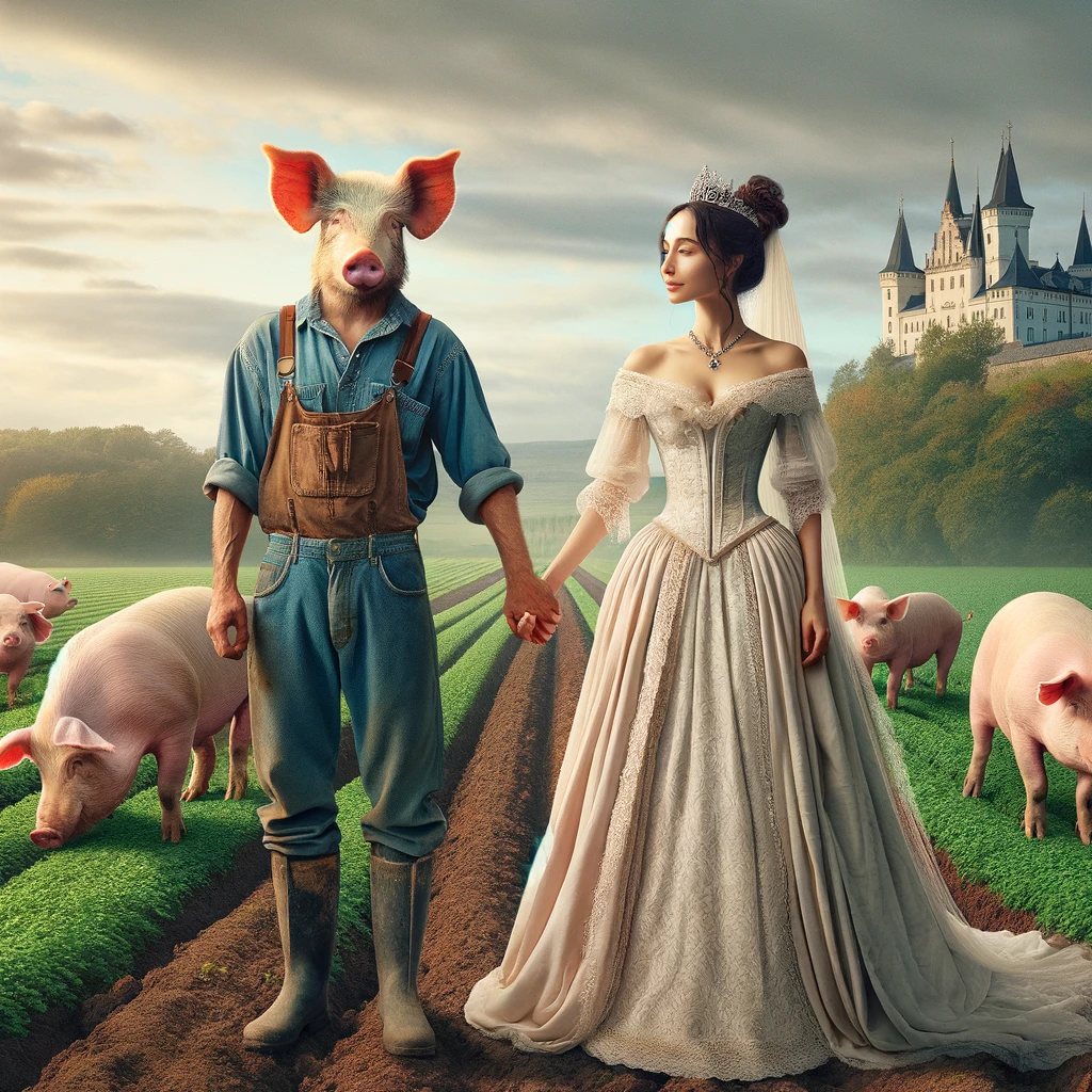 - Het derde plaatje was de opdracht aan AI om een blije varkensboer en prinses Anastasia te maken. Dit werd wel een hele echte varkensboer met een echte varkenskop.